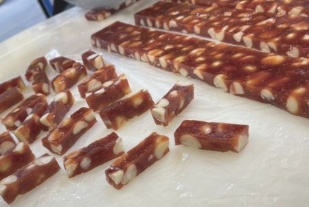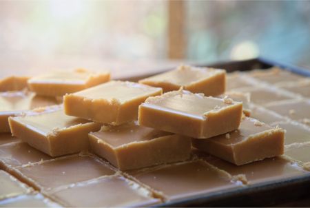 - Semi-fudge significa que o teor de água está entre 6%~15% após o cozimento e fervura, como nougat, leite condensado, coalhada de leite, caramelo de leite, pé-de-moleque, caramelo de amendoim, Chikki, Pé-de-moleque, doce de gergelim, Tahin Halva, e assim por diante.
